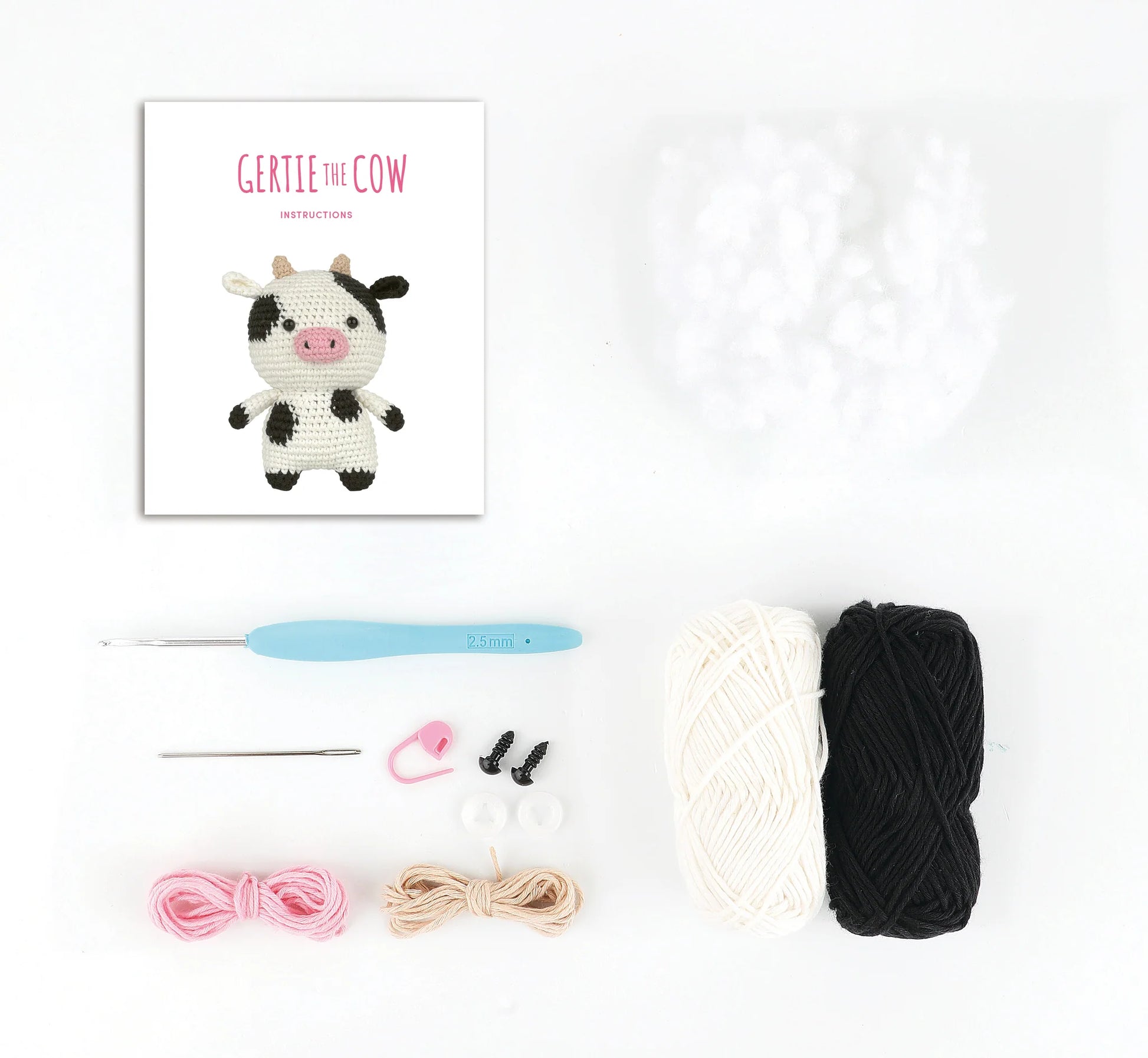 Intermediate crafters will love bringing this small Gertie the Cow design to life. The kit contains everything you need to make your amigurumi, including 100% cotton yarn, thread, a crochet hook, accessories, stuffing and instructions.