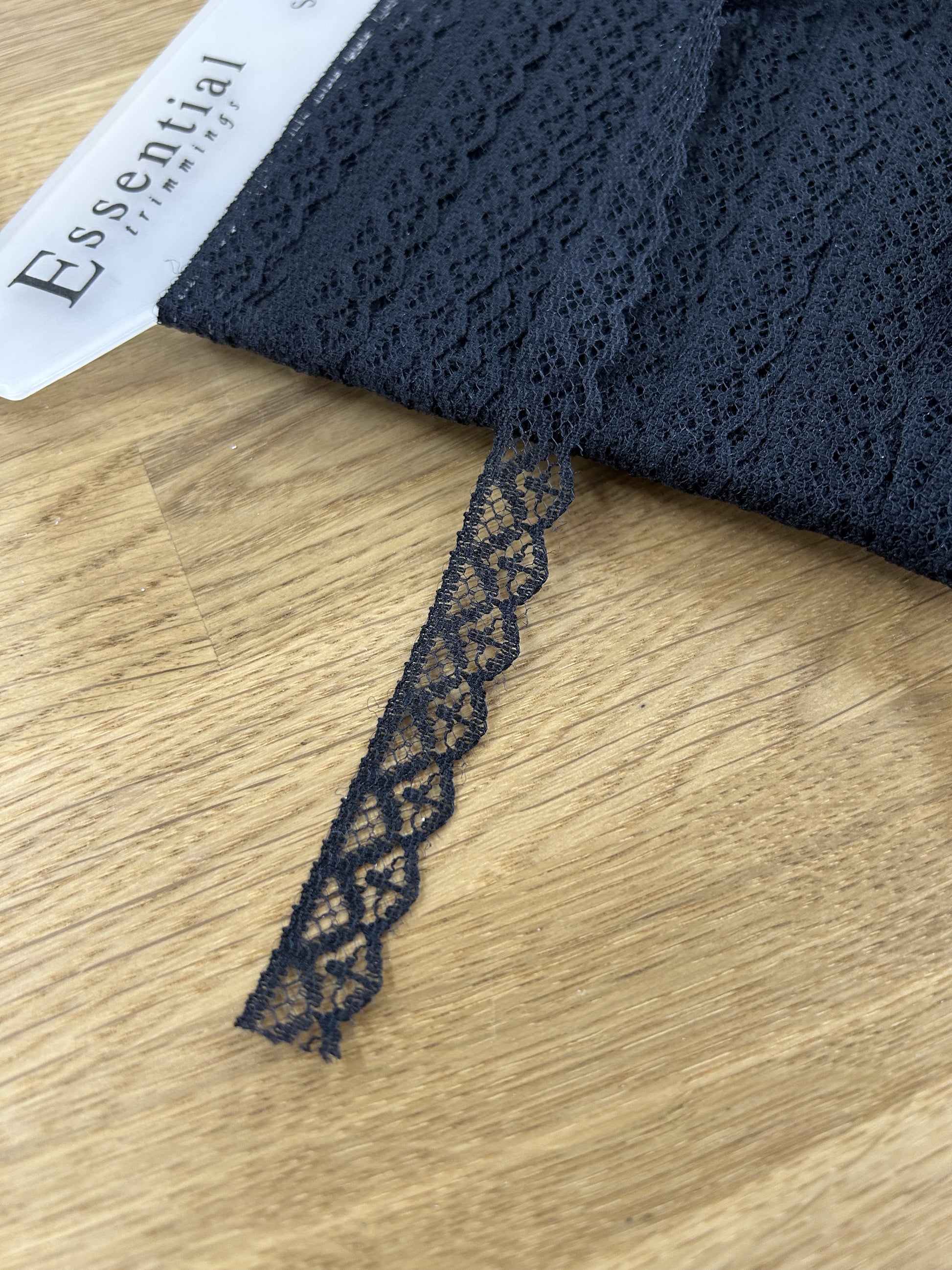 A delicate, narrow lace of small ovals creating a scalloped edge. A versatile soft lace but especially suited to children's clothes as it will not irritate skin. 40 deg. wash, cool iron, do not bleach, do not spin, do not tumble dry, dry cleanable.