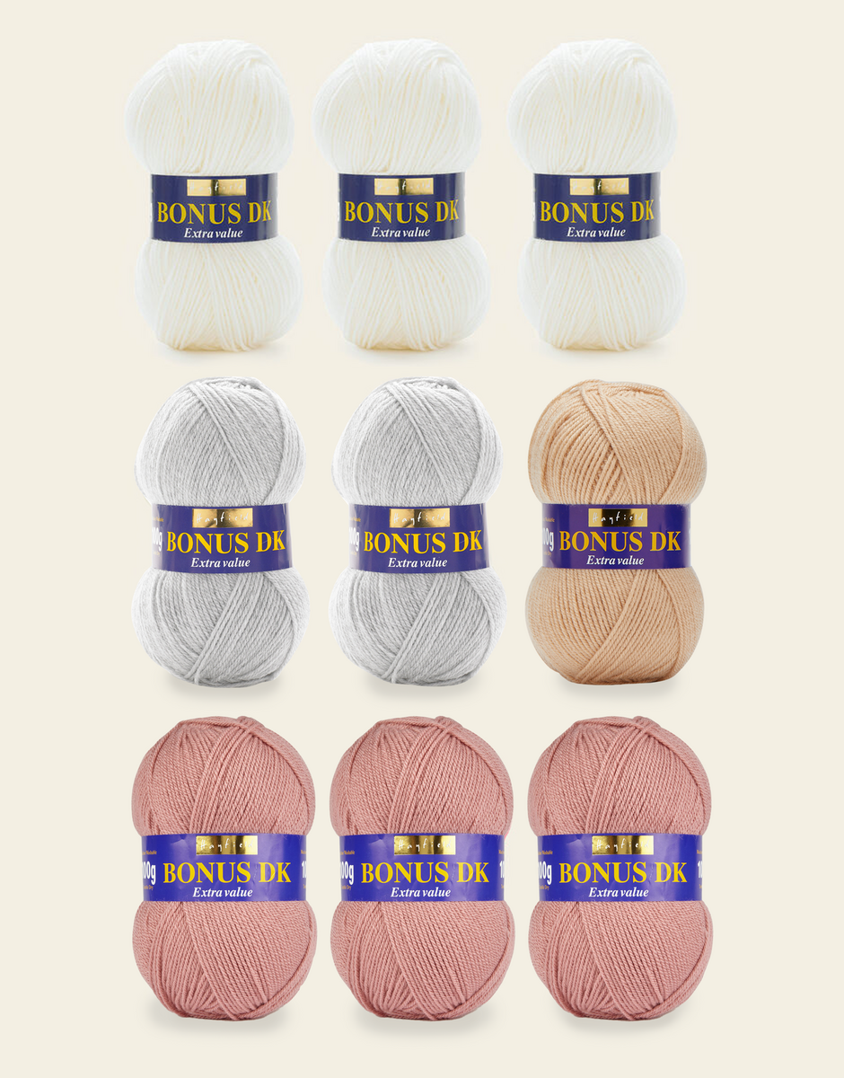 The Christmas Eve Wishes Blanket in dusky pink and grey bundle includes: 3 x Cream (812) 2 x Light Grey Mix (814) 3 x Dusky Pink (573) 1 x Champagne (598)