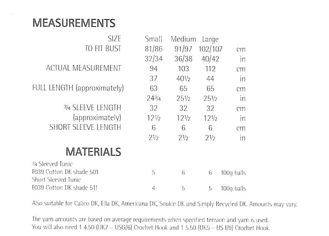 Woman's 3/4 or Short Sleeved Crochet Tunic. Sirdar Cotton DK is a cool and elegant, machine washable summer yarn. The subtle sheen gives crisp stitch definition making Sirdar Cotton perfect for crochet.