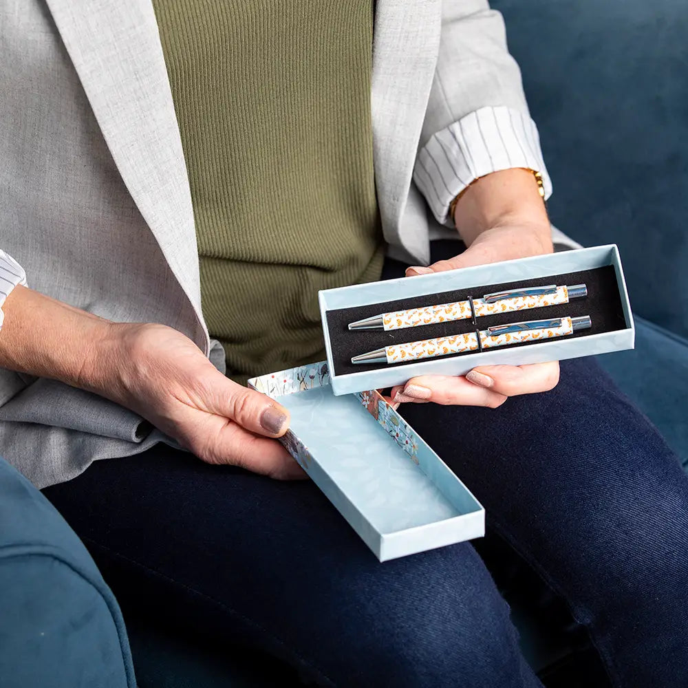 These elegant pens are ideal for effortlessly jotting down notes, with beautiful designs sure to inspire any writer. Practical and stylish, this two pen & box gift set is perfect as a present for the avid note-taker in your life – or an indulgent treat for yourself!  These pens write in black ink and can take standard refills.