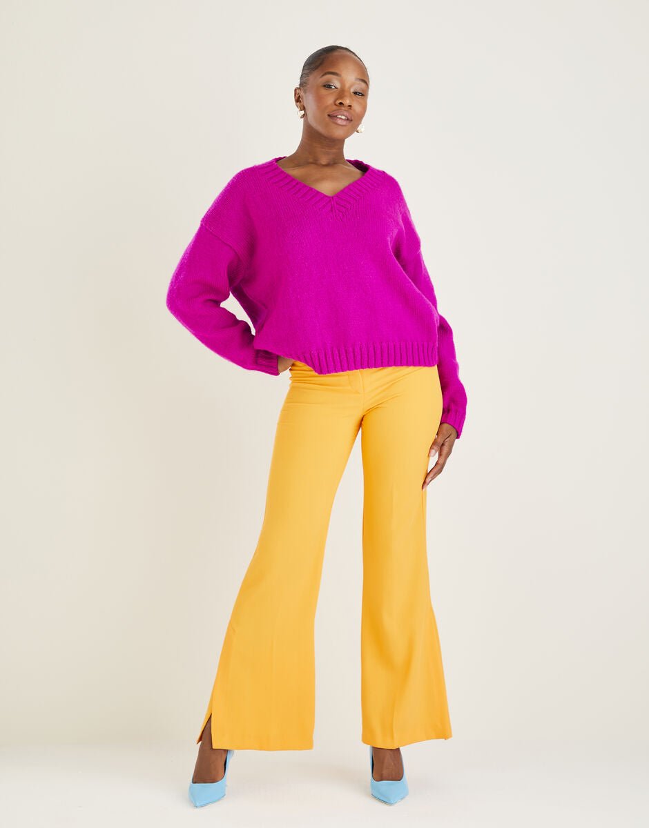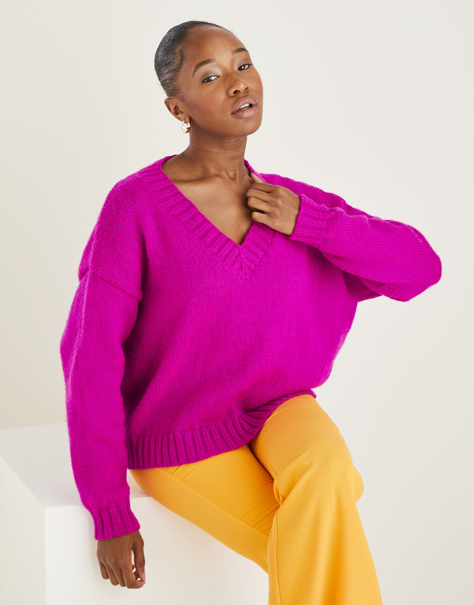 A lovely easy knitting pattern, in simple stocking stitch to build your confidence. Your oversized V Neck Sweater features striking 2x2 ribs and relaxed drop shoulders for a really flattering shape. Knit it time and again in a Mood-Boosting Bright or any of your favourite colours from our trend-led palettes.