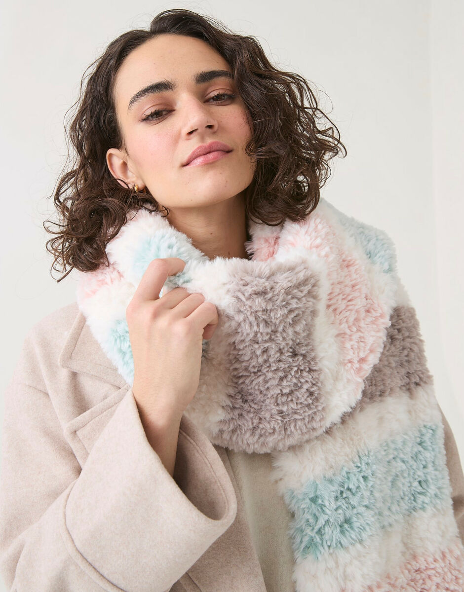 With a simple stripe design, this generous scarf is suitable for beginners to knit a cosy winter accessory in no time. Knitted in soft, fluffy Sirdar Alpine for a beautiful fur effect.