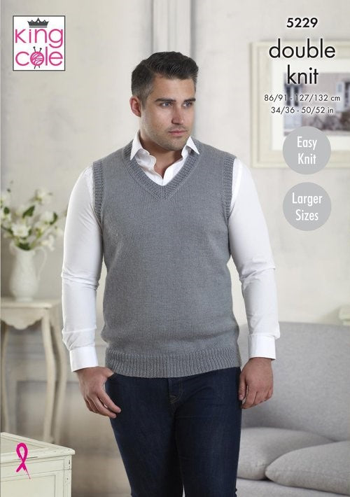 King Cole pattern 5229 is for a mens easy knit slipover and waistcoat to fit sizes 86 - 132 cm / 34 - 52 in.