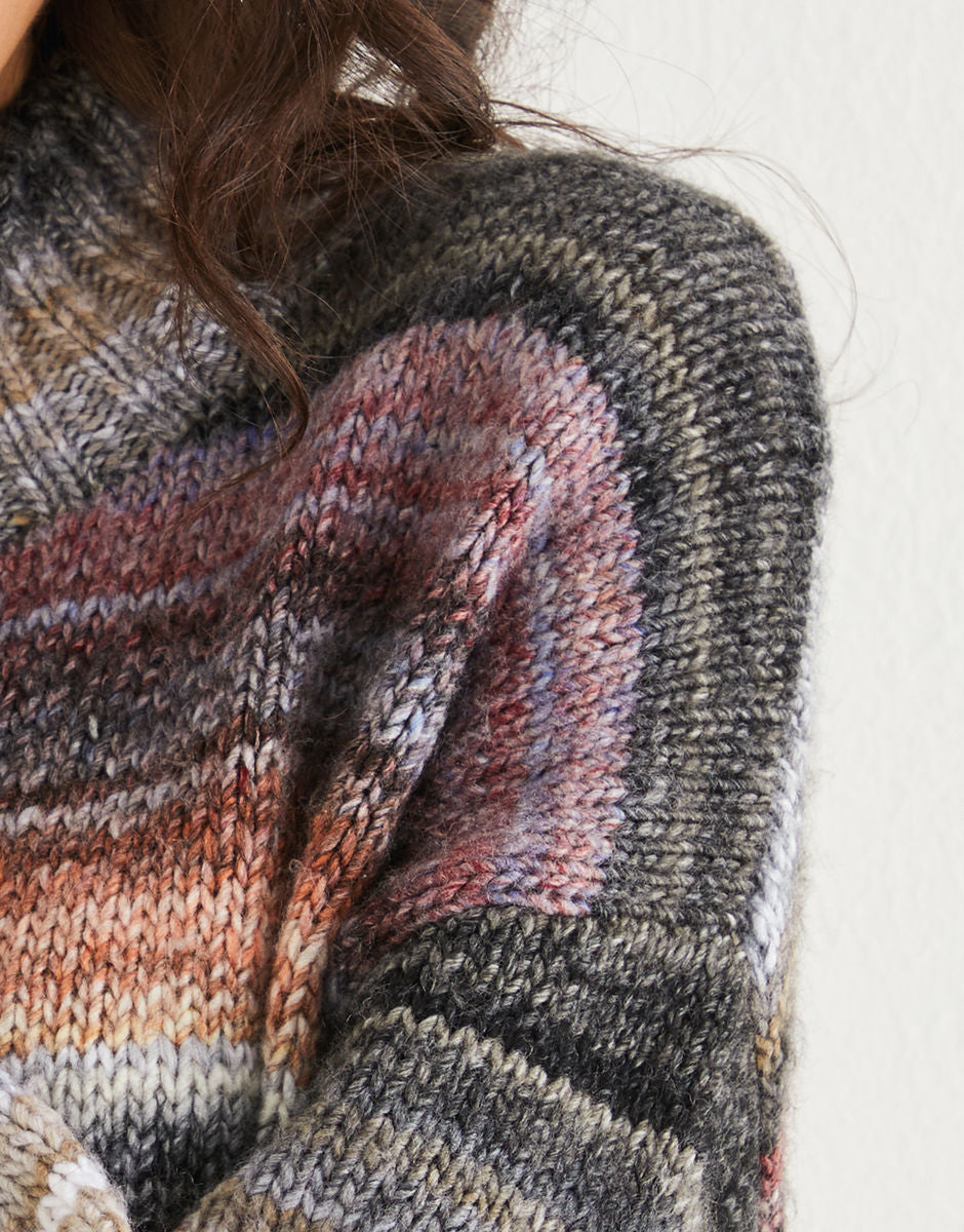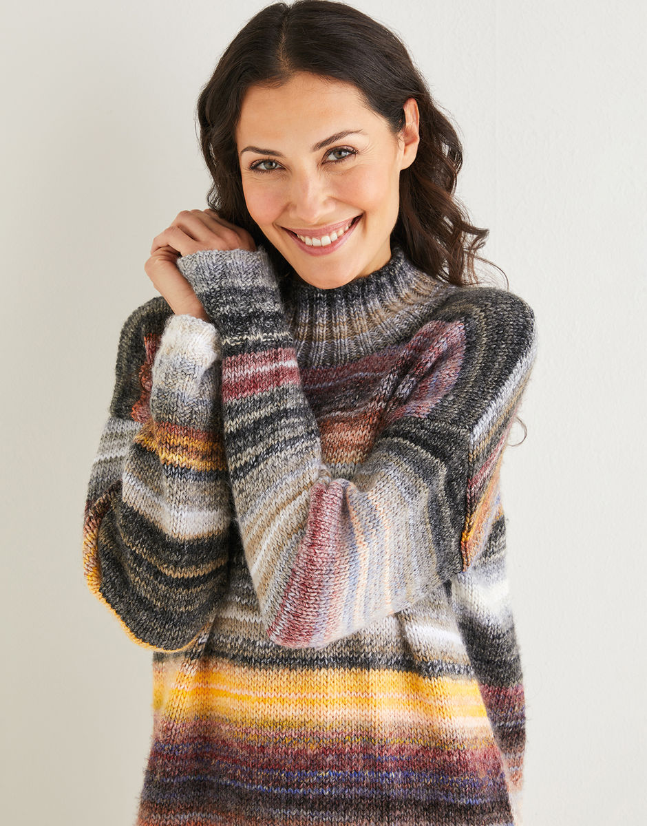 This laidback long-sleeved tunic dress in our Sirdar Jewelspun Aran adds a touch of colour to your knit without having to switch between yarns. Featuring a funnel neck, split seam and dropped shoulders for a snug fit. Style it with your favourite knee-high boots to finish off the look.