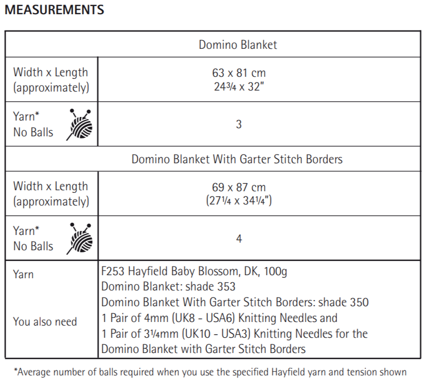 You'll also need: 1 Pair of 4mm (UK8 - US6) Knitting Needles and 1 Pair of 3¼mm (UK10 - US3) Knitting Needles for the Domino Blanket with Garter Stitch Borders