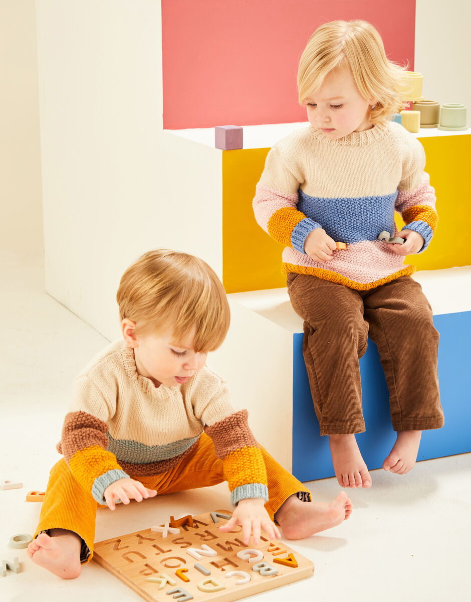 An easy knitting pattern, you'll use stocking stitch and moss stitch in modern shades of Snuggly DK to make this colour-block sweater from our Building Blocks collection of knitting patterns for babies. Knit both colourways to create a co-ordinating set for siblings or little besties.