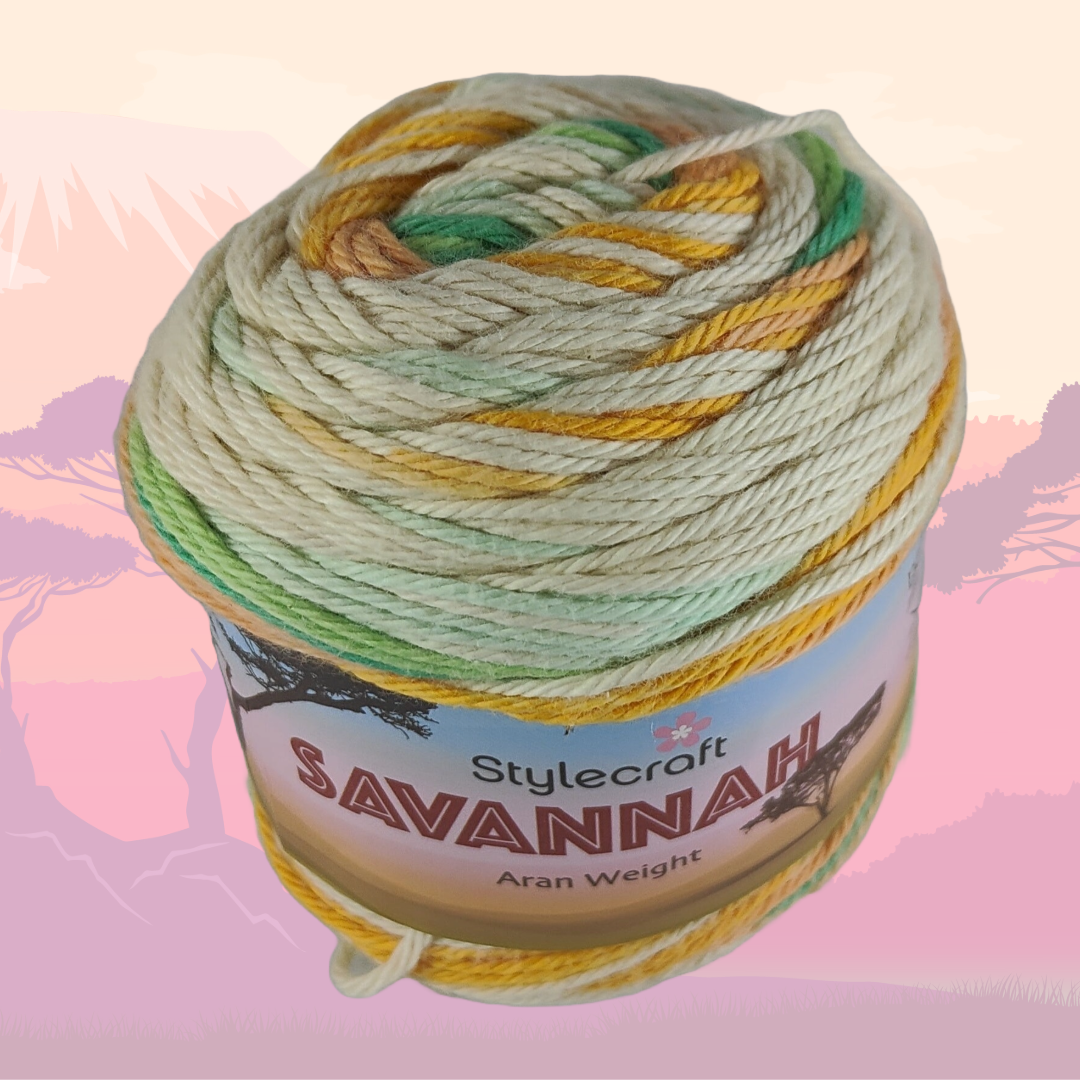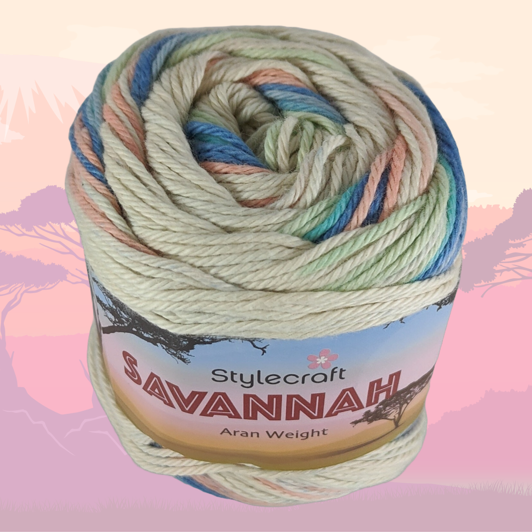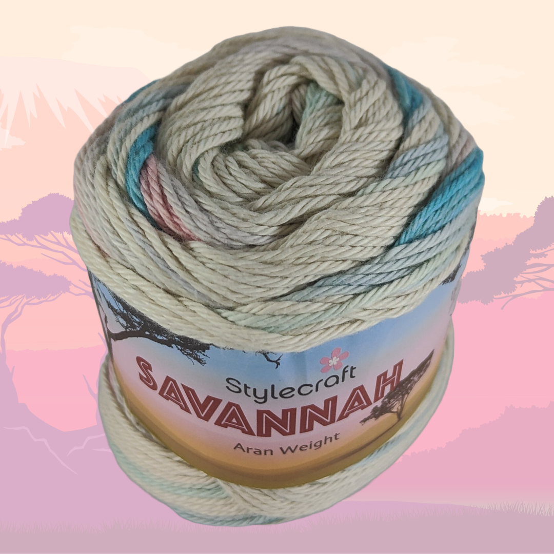 Be transported to warm sub-tropical grasslands with Savannah yarn. This aran weight yarn has a long colour change and is made using 100 % cotton meaning it’s not only cool but natural too so perfect for sensitive skins.