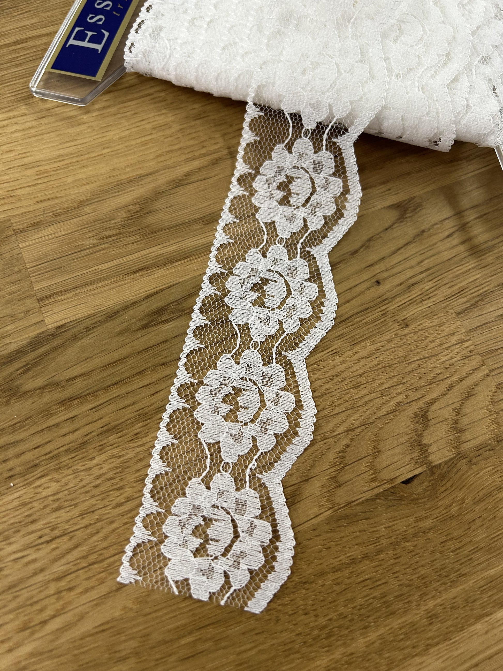A strong floral design, ideal for projects where the lace needs to stand out and the design to remain prominent. A light weight trim, suitable for clothing projects. 30 deg. wash, cool iron, do not bleach, do not tumble dry, dry cleanable.