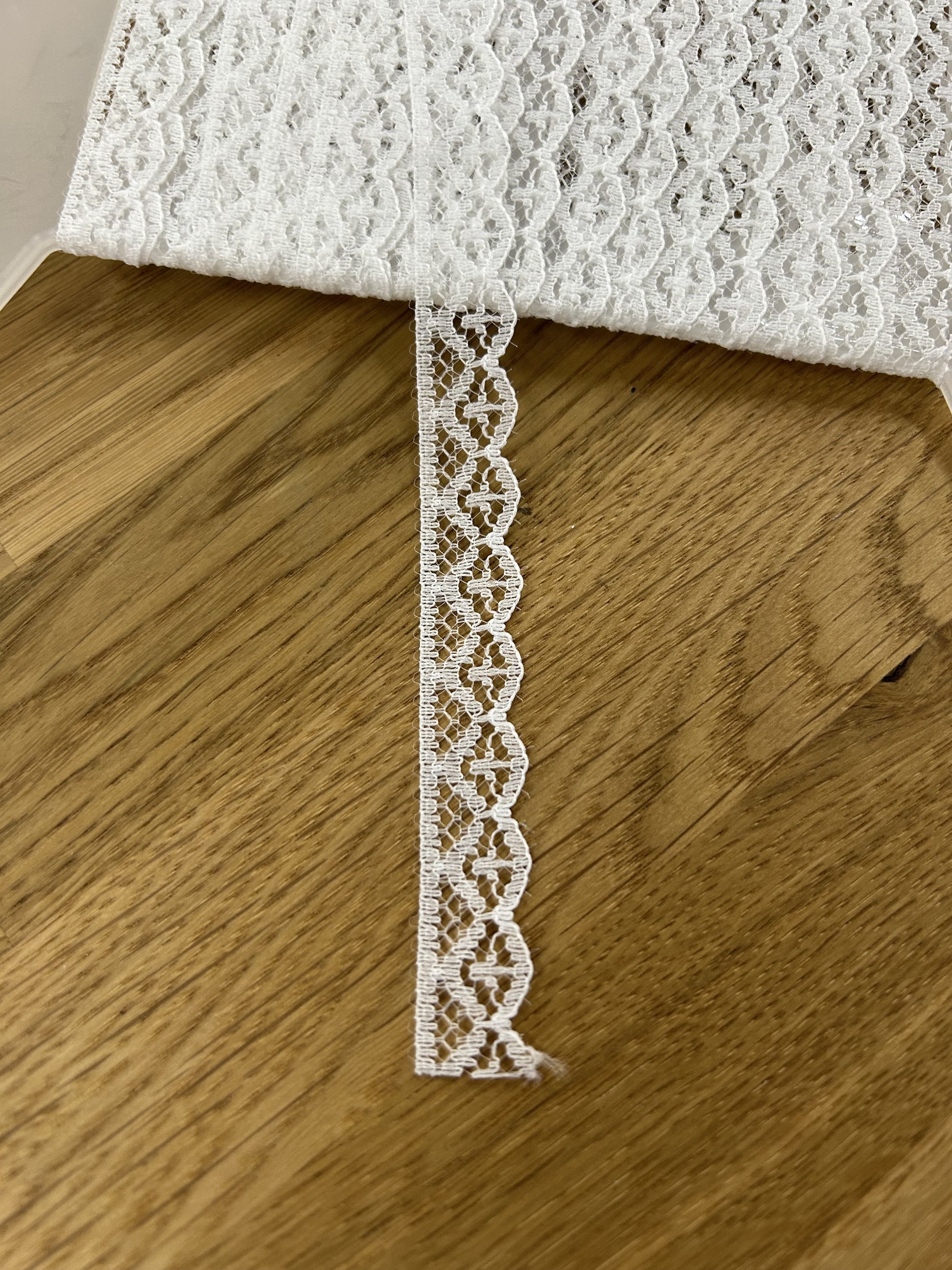 A delicate, narrow lace with a scalloped edge. A versatile soft lace but especially suited to children's clothes as it will not irritate skin. 40 deg. wash, cool iron, do not bleach, do not spin, do not tumble dry, dry cleanable.