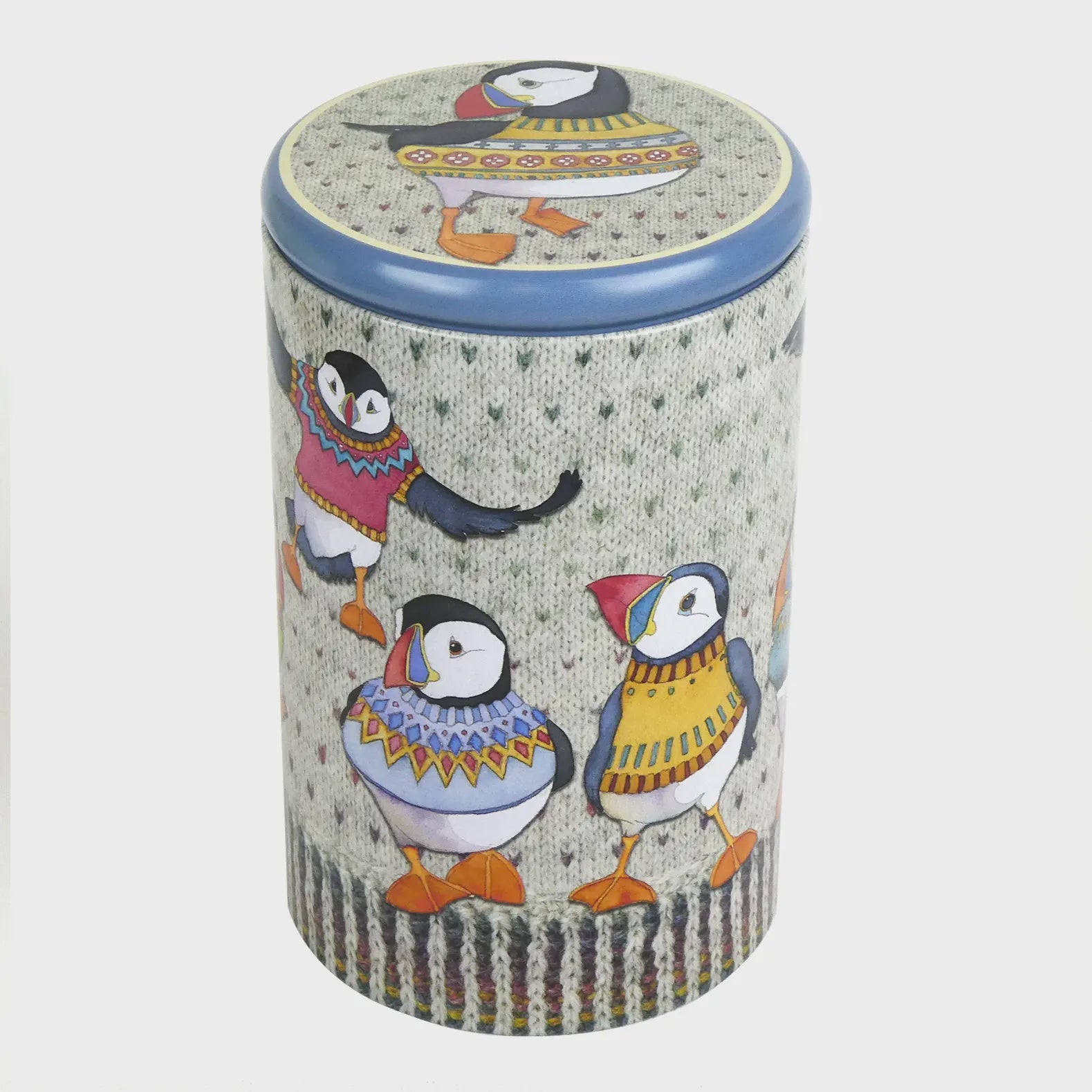 This tall storage caddy features Emma’s Woolly Puffin artwork. These caddies are great for storing your kitchen bits, crafty things, or secret treats! Printed on all surfaces, (including the bottom!) these also make a special gift. The tins measure 10cm in diameter and are 16.5cm high.